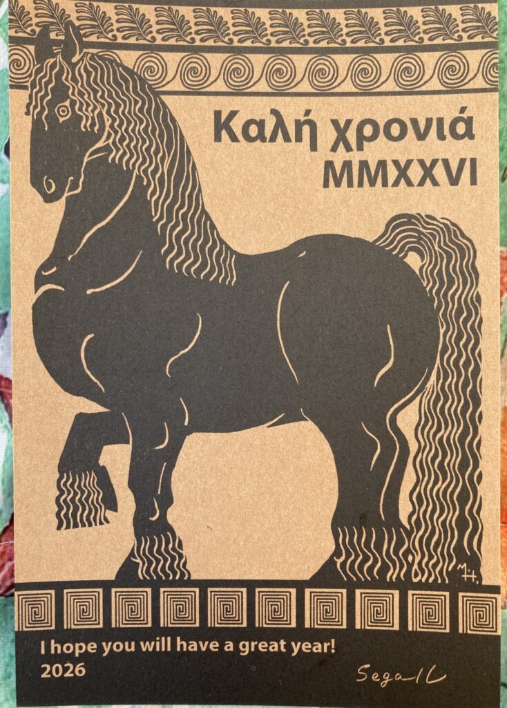 今年も結局、ギリシャの壺絵風でやりました。今まではずっとアラブ馬だったのですが、もう飽きちゃったので、私の好きな大きい馬にしました。ギリシャの壺絵職人を自分におろして描く作業、12年おきにやってますが、楽しいです。今年は壺絵のZINE作りたいです。